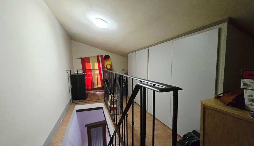 Al primo piano, a cui si accede dal soggiorno con una caratteristica scala in ferro di design, troviamo un'ampia soffitta utilizzata come camera.