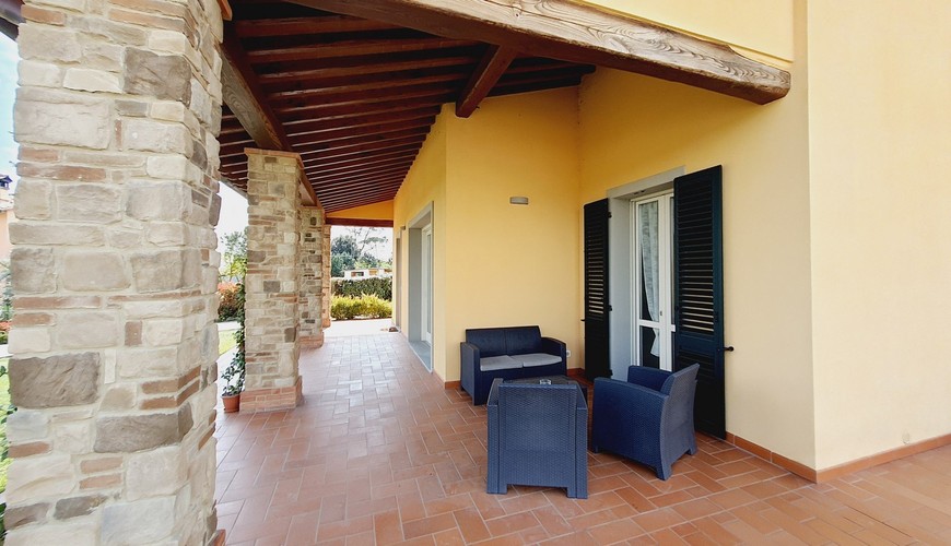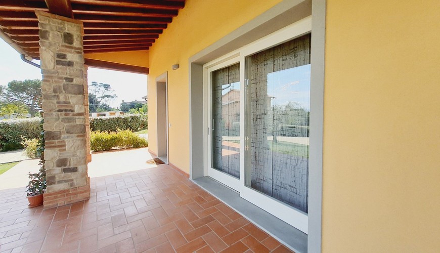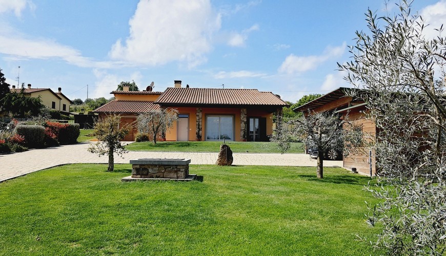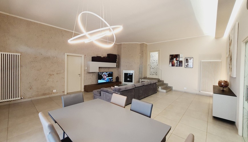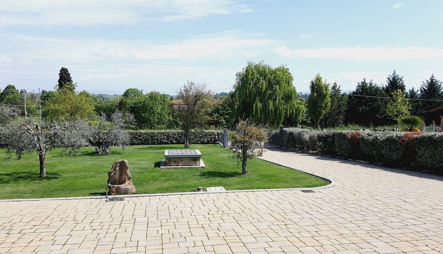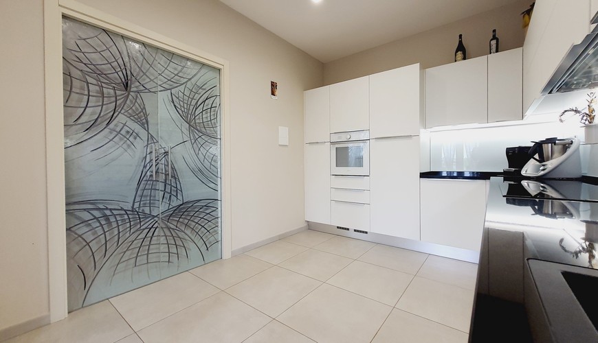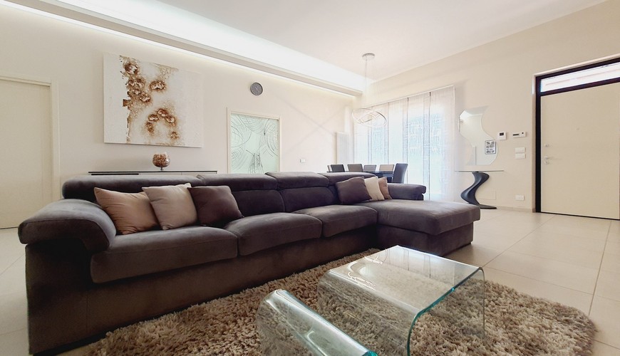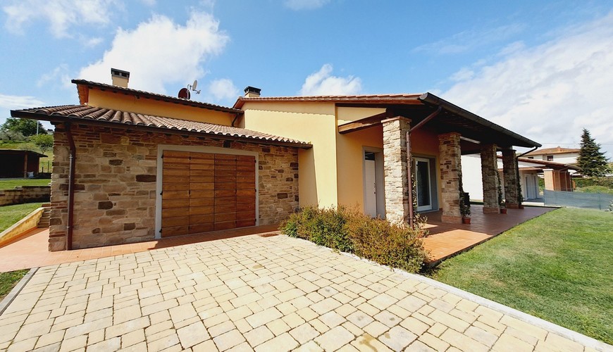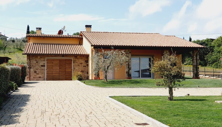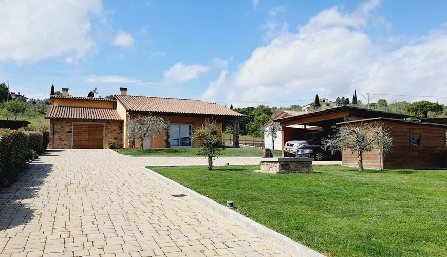 Highly energy efficient design villa with 1360m2 of garden. The newly built property is on one level and offers a large 50m2 living area with a sliding window overlooking the covered loggia. A spectacular sliding glass door leads to the dining area where we find a beautiful kitchen with LED-lit Magnetolab wall and absolute black marble top. The designer bathroom completes the living area. In the sleeping area we find two double bedrooms both with large windows overlooking the garden, a single bedroom and the main designer bathroom with shower and bathtub. The 40m2 garage is on the ground floor and is connected to the living area. There is also an attic. Photovoltaic system, solar thermal system with domestic hot water storage system, hydro pellet hearth in the living room, wood-burning hearth in the garage, alarm system, video surveillance system, artesian well with automatic irrigation, automatic gate, wooden window frames with mosquito nets .