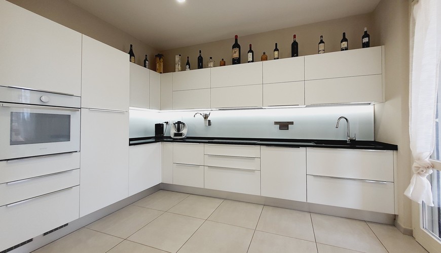 The custom-made kitchen with bright wall and induction hob is included in the sale.