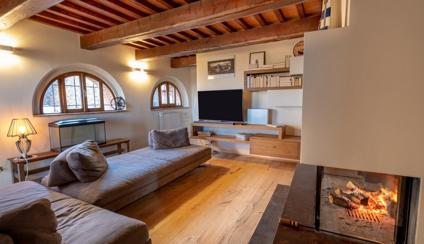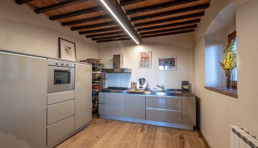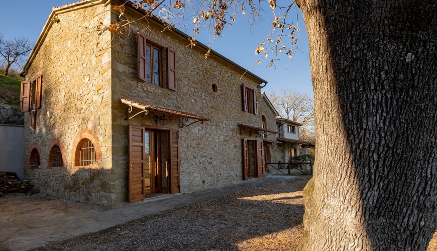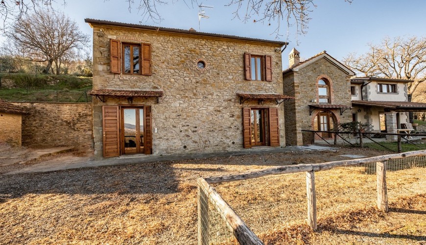 Detached stone villa located in a beautiful, panoramic hillside location just a few kilometers from the city of Arezzo, close to all the amenities in the center of Castiglion Fibocchi. The single-family home features exposed stone exteriors and is part of a small group of just four units, nestled on the hillside with sweeping views of Arezzo. Completely renovated in 2017 with quality materials, it extends over two floors. The ground floor features a spacious living room with a stunning suspended fireplace, a large kitchen with dining area, a bathroom with shower, and stairs leading to the first floor, which contains three double bedrooms and a large bathroom with shower. The ground floor leads to a private front garden with a beautiful century-old oak tree, and the entire property is surrounded by a private terraced garden. If you're looking for a space immersed in nature yet close to every convenience, a space just a kilometer from the main road, free from cars and pedestrians, where you can wake up in the morning to the sounds and colors of nature, this is the ideal place for you.