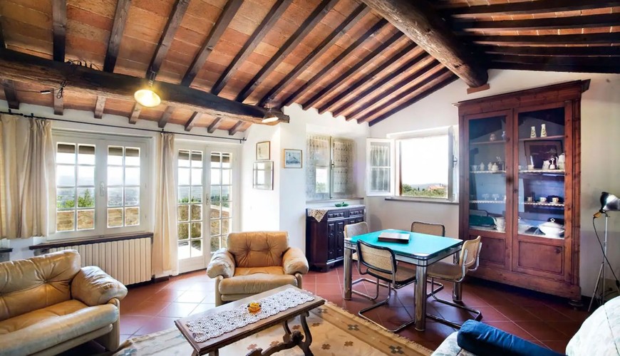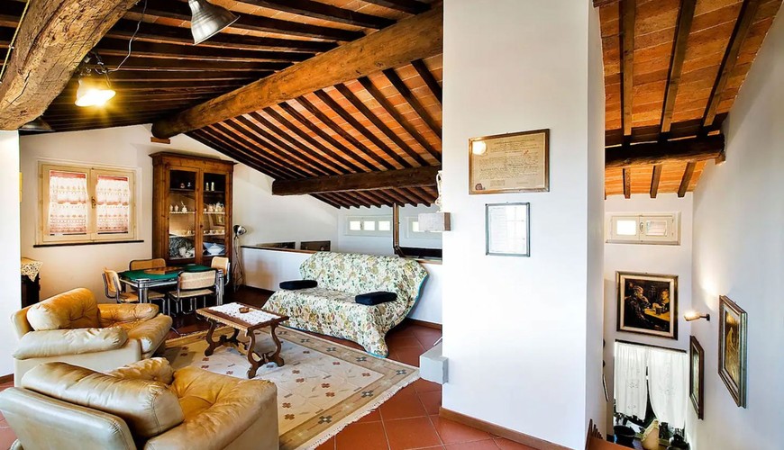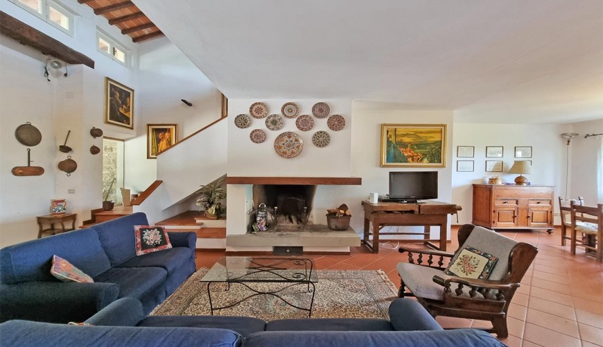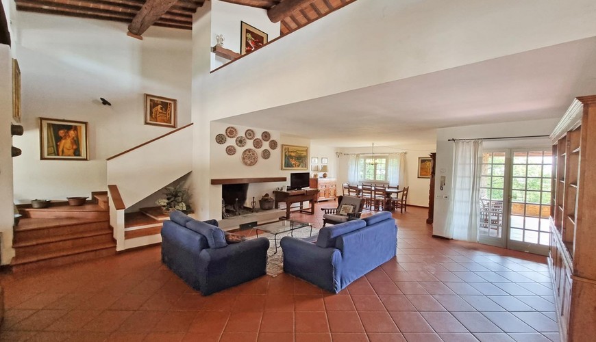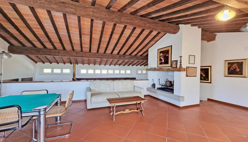 Entrando a piano terra veniamo accolti da ampio salone con camino dal quale si accede ad un’ampia terrazza panoramica con travi in legno.