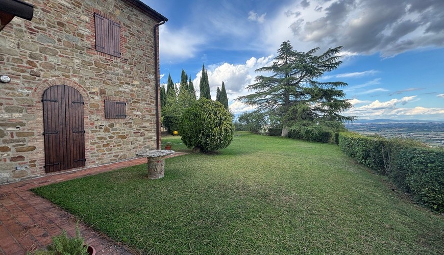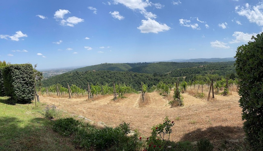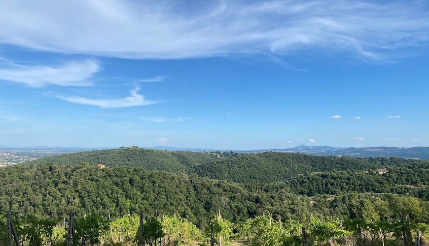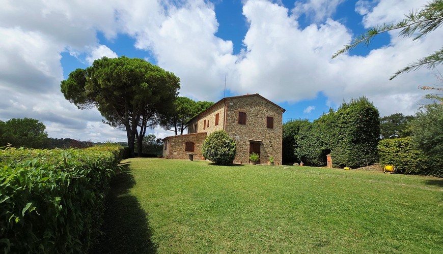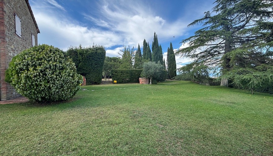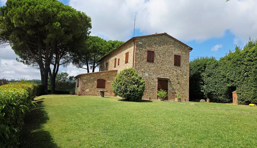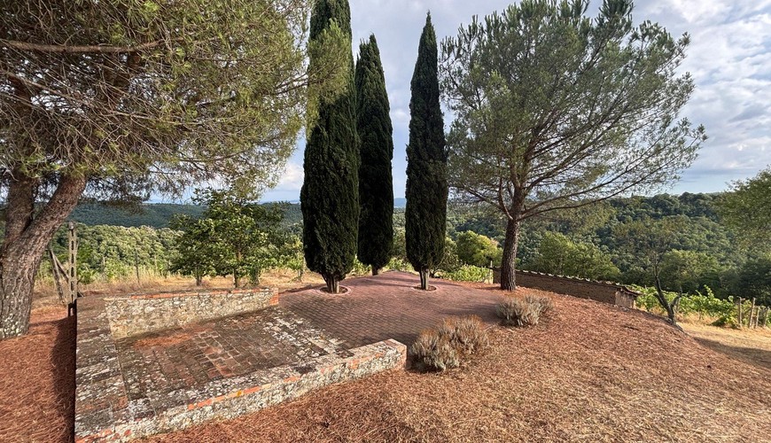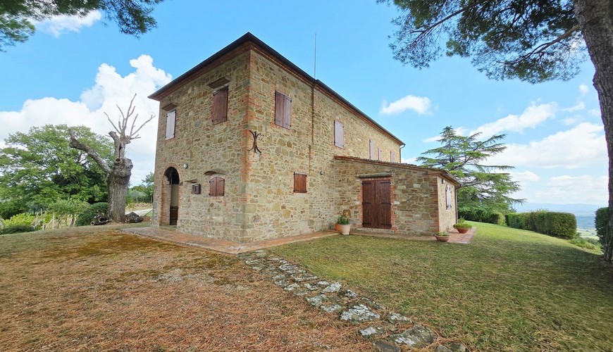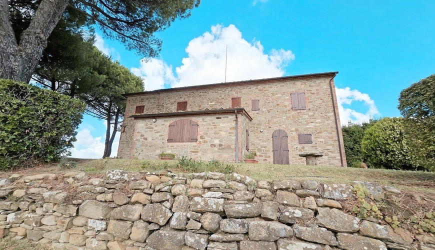 Sulla cima di una collina che offre una vista veramente unica sul paesaggio della Valdichiana e del Monte Amiata vendiamo uno splendido casale toscano in pietra del XVIII secolo circondato da un parco di cipressi e pini con circa 5 ettari di terreno tra vigneti (Chianti Colli Senesi DOCG), oliveti (Olio EVO) e bosco mediterraneo.