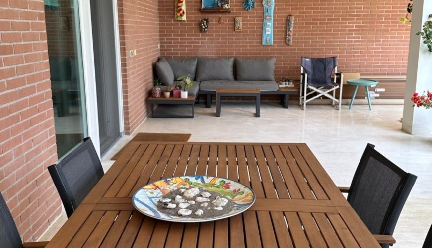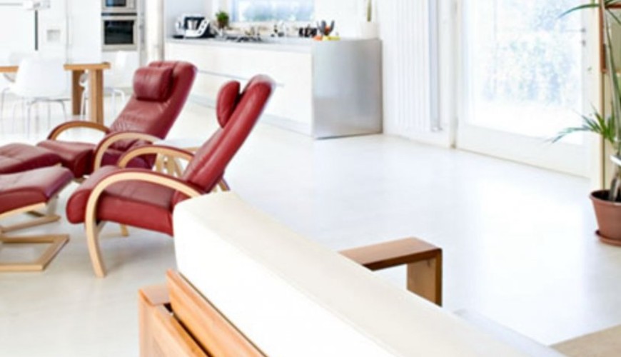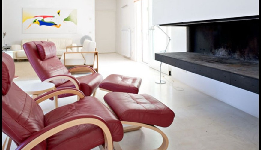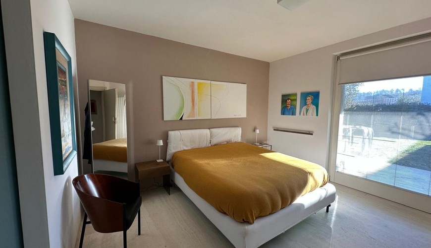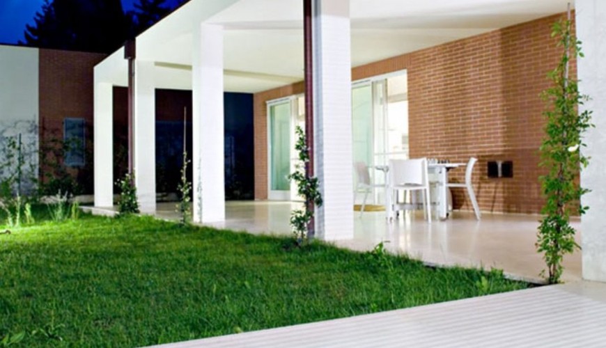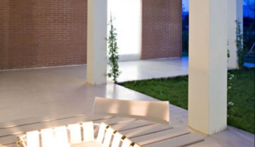 Villa di design di 177mq disposta su un'unico livello con sagoma a "L" in cui l'elememento centrale è la grande zona living di 75mq con finestroni scorrevoli che affacciano sul porticicato esterno e sul giardino.