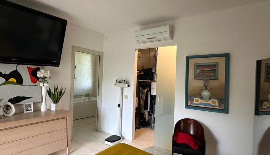 Nella zona notte troviamo tre camere matrimoniali, di cui una con bagno e cabina armadio, un ulteriore bagno e lavanderia. Tutto il piano, compreso il portico, ha il pavimento in travertino chiaro. Da un ampia e comoda scala , posta tra la zona giorno e la zona notte , si accede al piano seminterrato, che occupa una superficie di 180 mq di su cui sono collocati vani accessori, un bagno e una grande sala cinema di 72 mq. Al seminterrato vi si accede anche dal giardino tramite scala esterna.